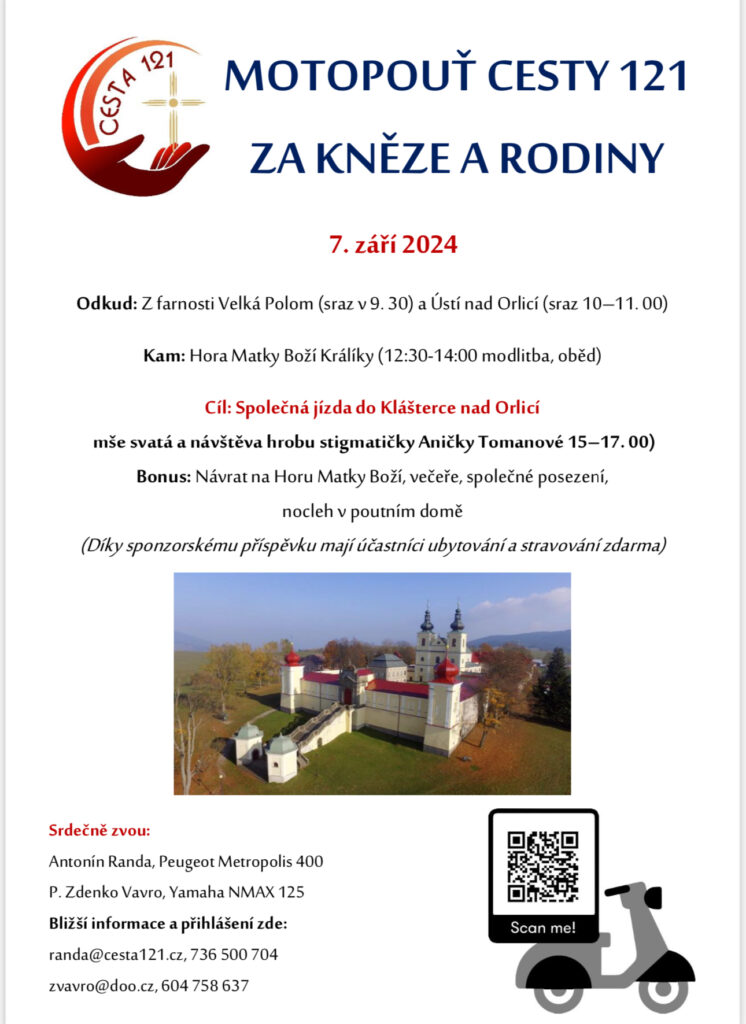 Cesta 121 Vás zve na nultý ročník moto poutě za kněze a rodiny na poutní místo do Králík a ke hrobu Anny Tomanové.